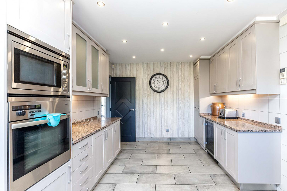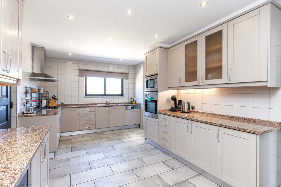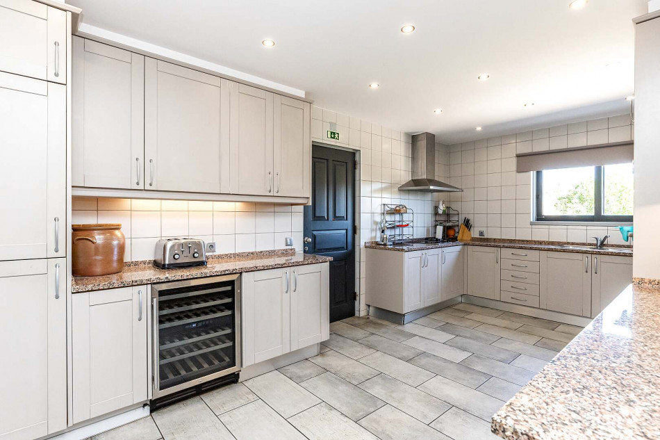 There is a fully equipped kitchen with wine cooler, built-in fridge freezer, dishwasher, oven, microwave, 2 ceramic hobs and 2 gas burners, double sink and a pantry with an extra 2 full height fridges and washing machine.