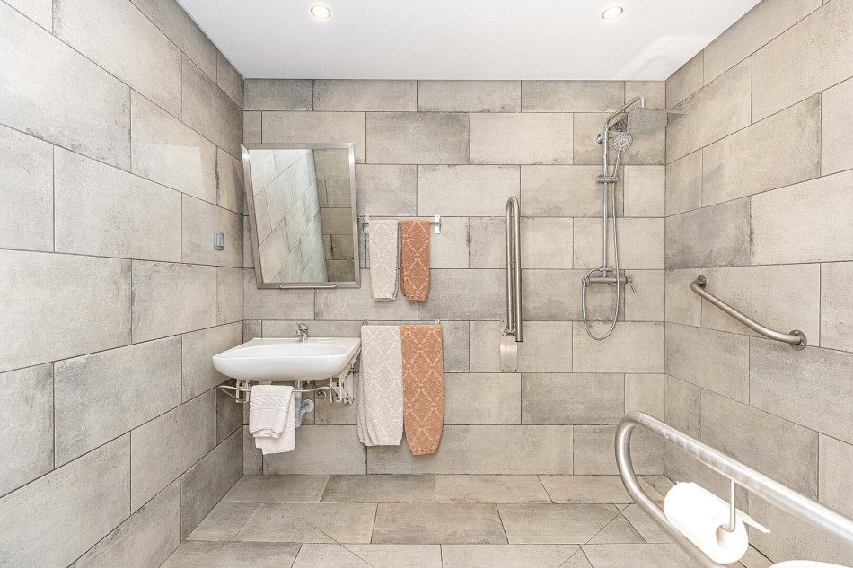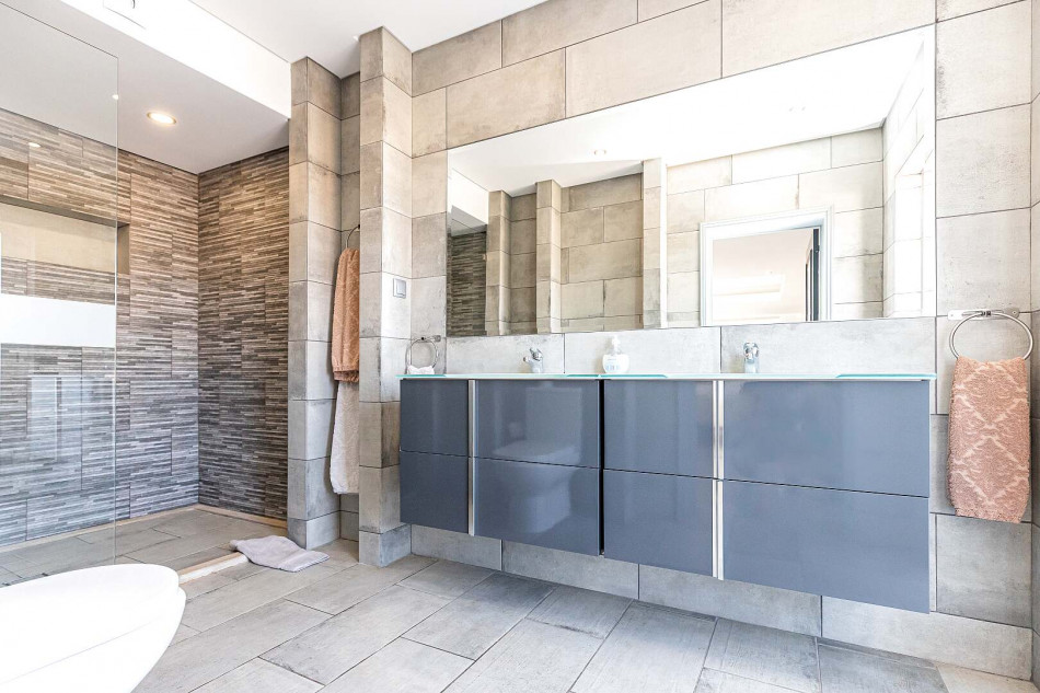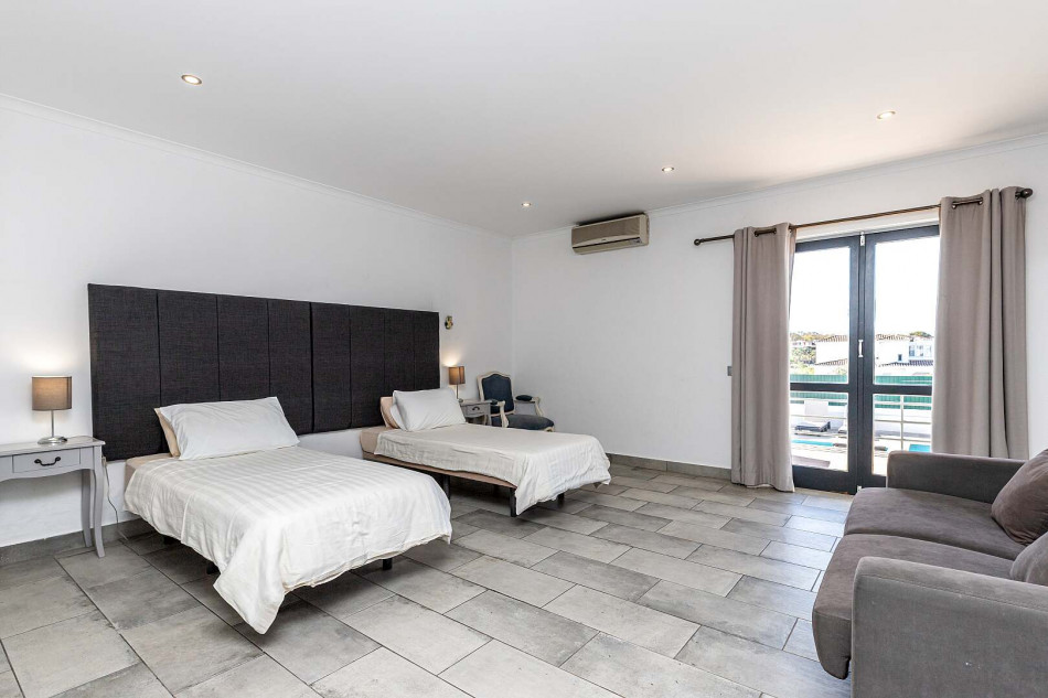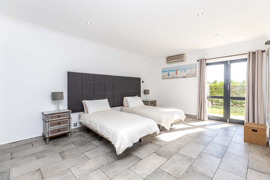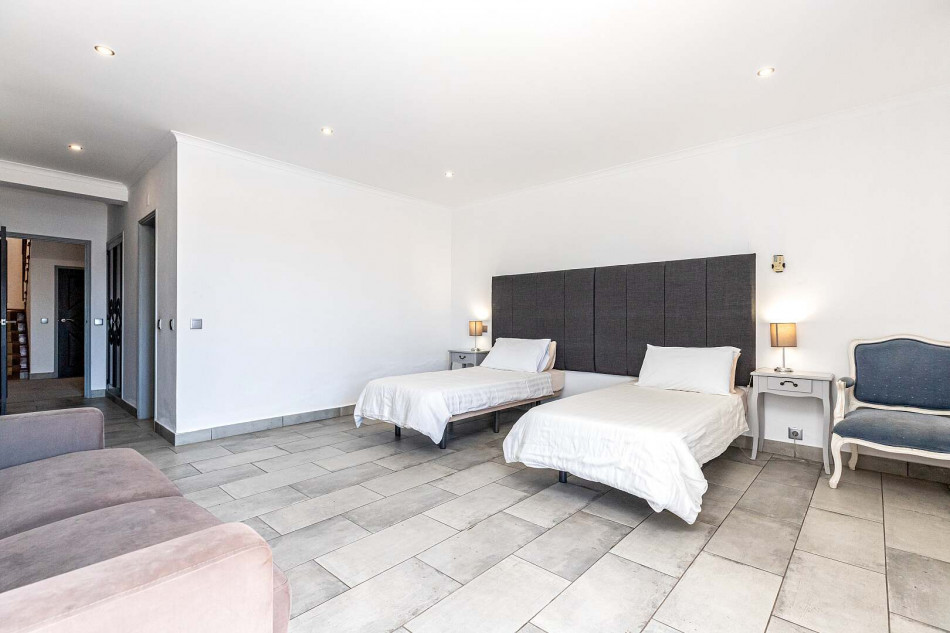 Still on this floor, there are 2 x twin bedrooms with ensuite shower, toilet and washbasin, 1 wheelchair friendly bedroom with and ensuite wet room with shower, toilet and bidet. The covered terraces offer a large relaxed seating area, a dining area, an outdoor kitchen with a charcoal barbecue and two gas barbecues.