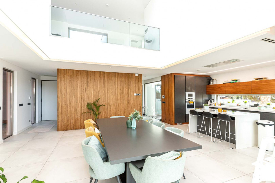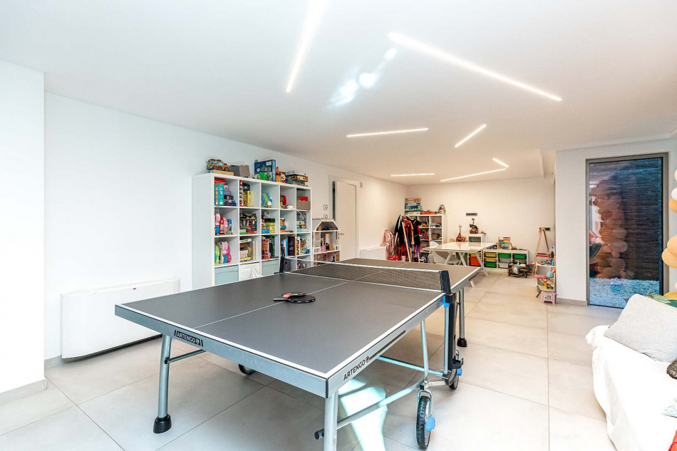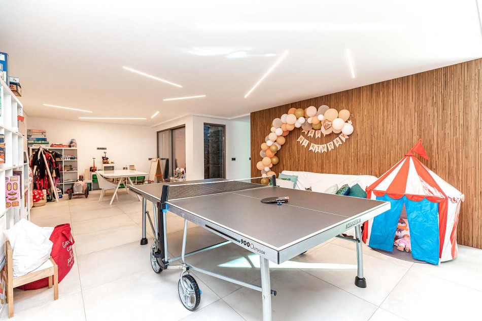 The basement comprises the 5th en-suite bedroom, a laundry room, a spacious garage, a cinema room, a games room, a wine cellar, an indoor garden, a covered terrace with direct access to the ground floor area via a staircase, a technical room and the pool room.