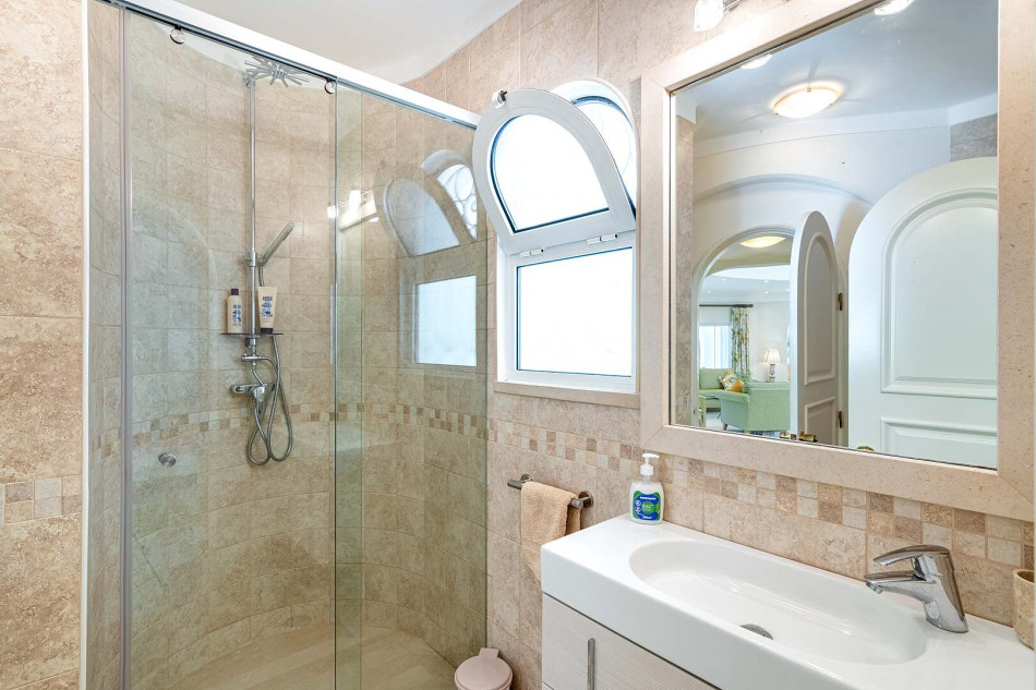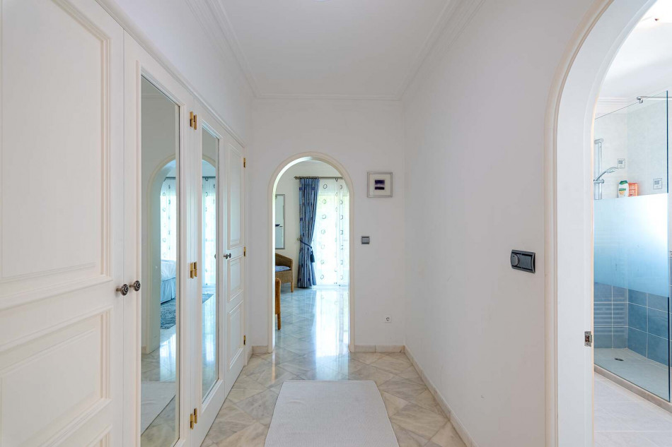 Venturing to the upper level, you'll discover the master bedroom, a private sanctuary complete with a wrap-around terrace overlooking the picturesque golf course. This delightful retreat also boasts a walk-in wardrobe and a lavish en-suite, where you can indulge in relaxation and tranquility. Adjacent to the master bedroom is another en-suite bedroom, ideal for versatility and comfort. An inviting cosy sitting area with a circle brick ceiling creates an intimate space for quiet moments of reflection.