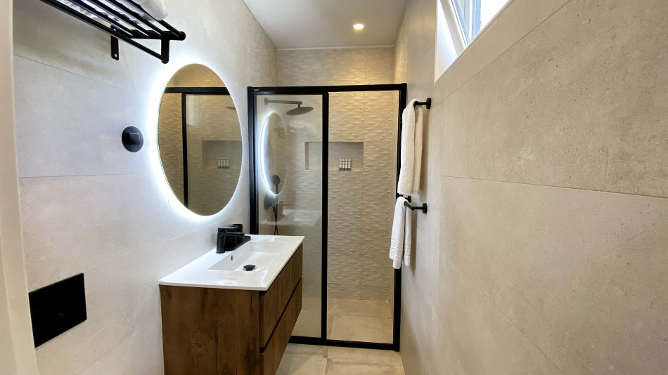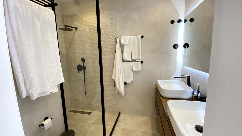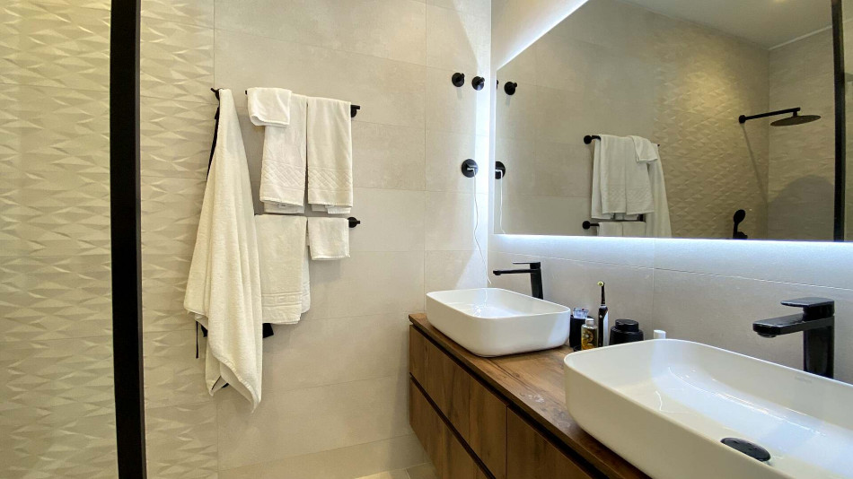 The apartment offers a master suite that redefines luxury living. With its own private bathroom, this retreat provides the perfect blend of convenience and comfort. An additional bathroom is thoughtfully placed to cater to the needs of your guests, ensuring a seamless and enjoyable stay for all.