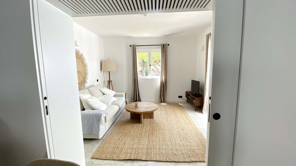 The living room exudes comfort and elegance, adorned with a beautiful decoration that creates an inviting atmosphere. For moments when privacy is desired, the living room features a sliding door, discreetly separating the space for guests. As the day comes to a close, step out onto your private balcony and bask in the stunning views that surround you, immersing yourself in the tranquillity of the resort's lush surroundings.
