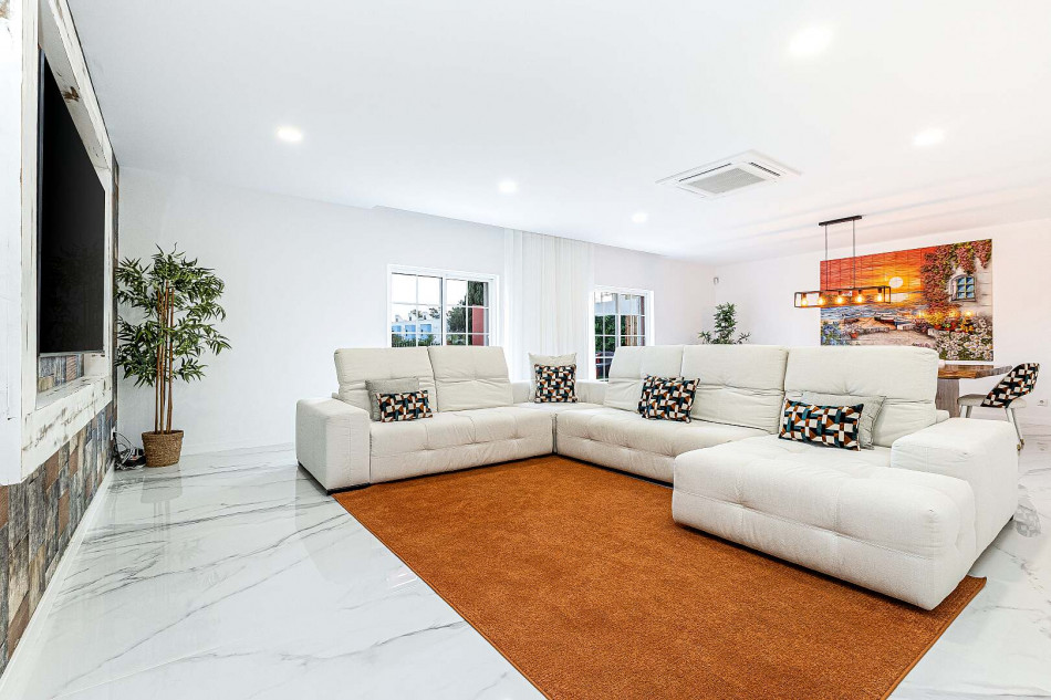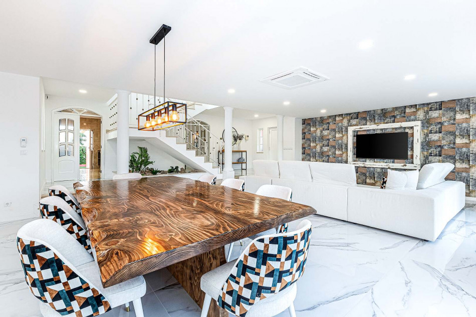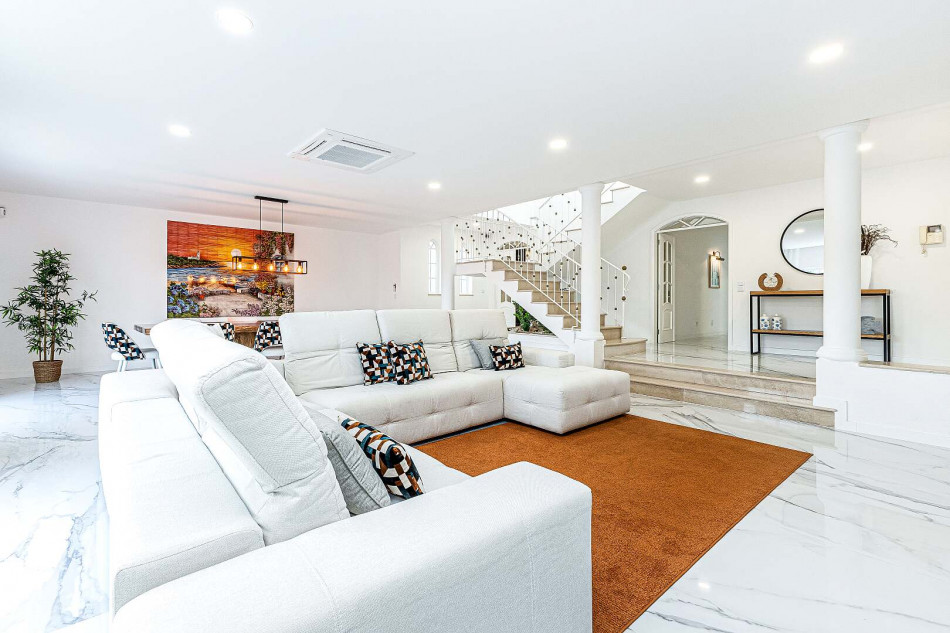Inside, an abundance of natural light floods the spacious interiors through large windows, creating an inviting ambiance throughout. Each room is fitted with air conditioning to ensure year-round comfort, while bespoke furnishings curated by renowned designers further elevate its allure.