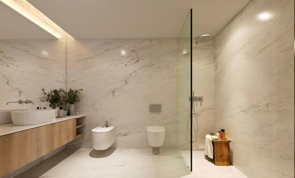 NEOLITH ceramic tiles, wall-hung toilets and heated floors.