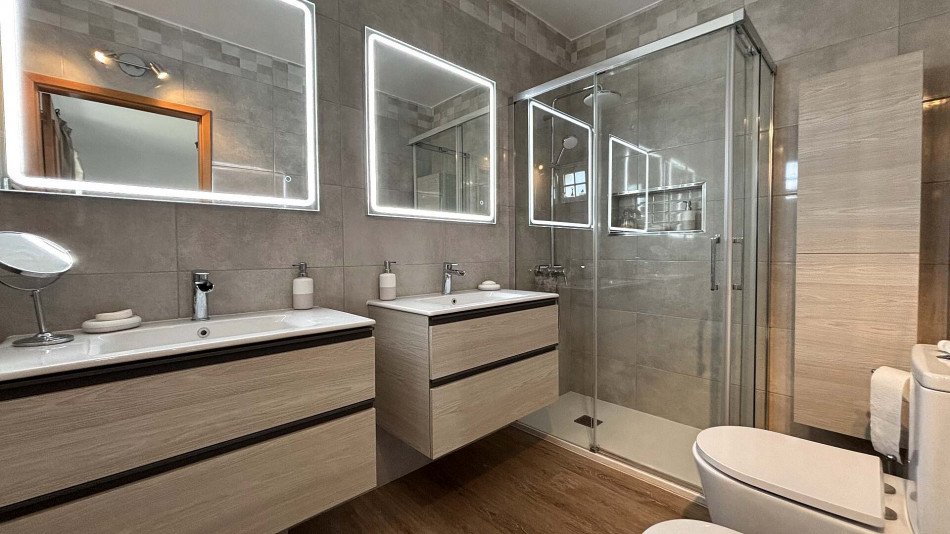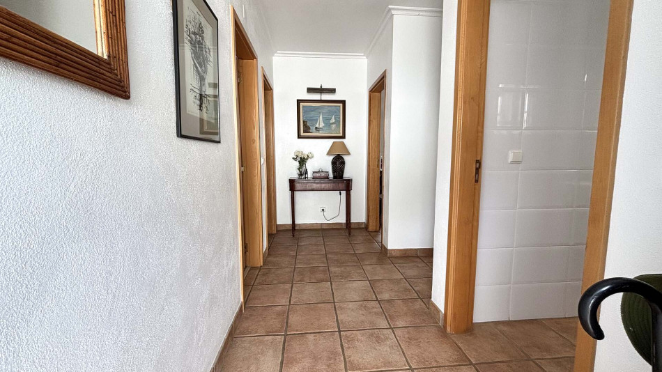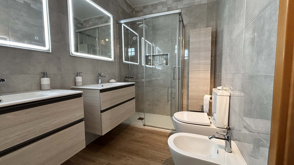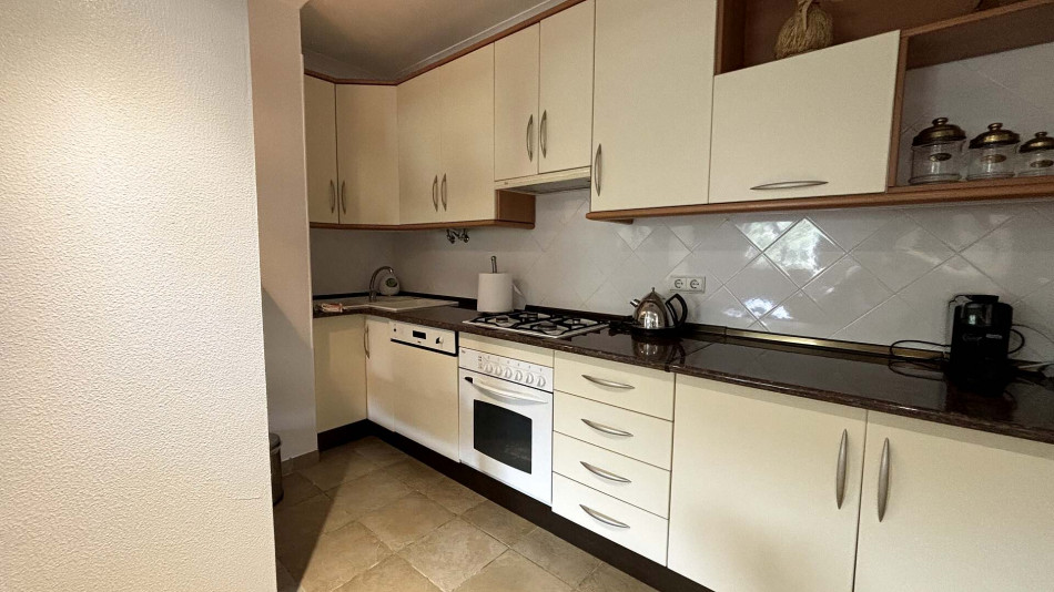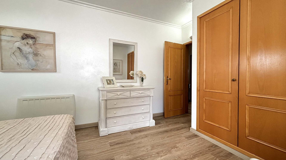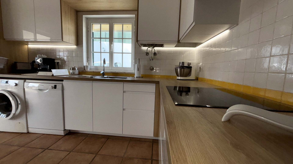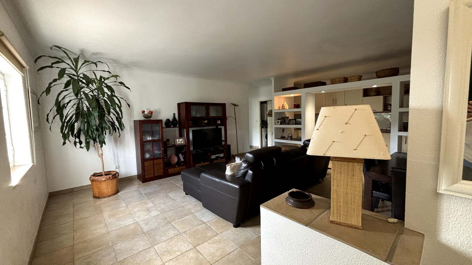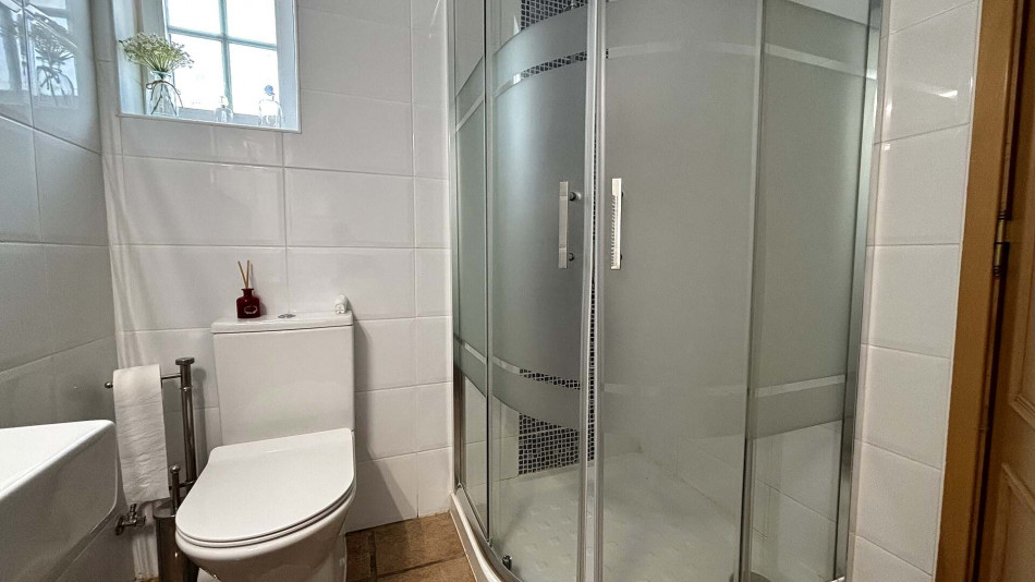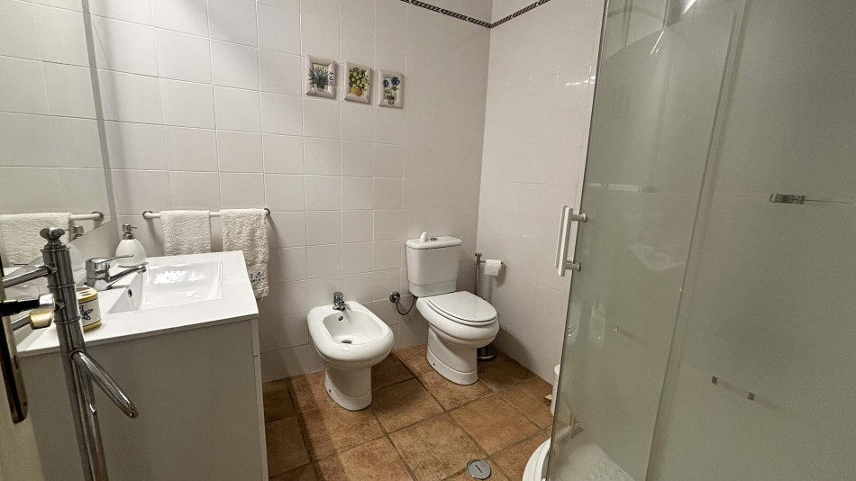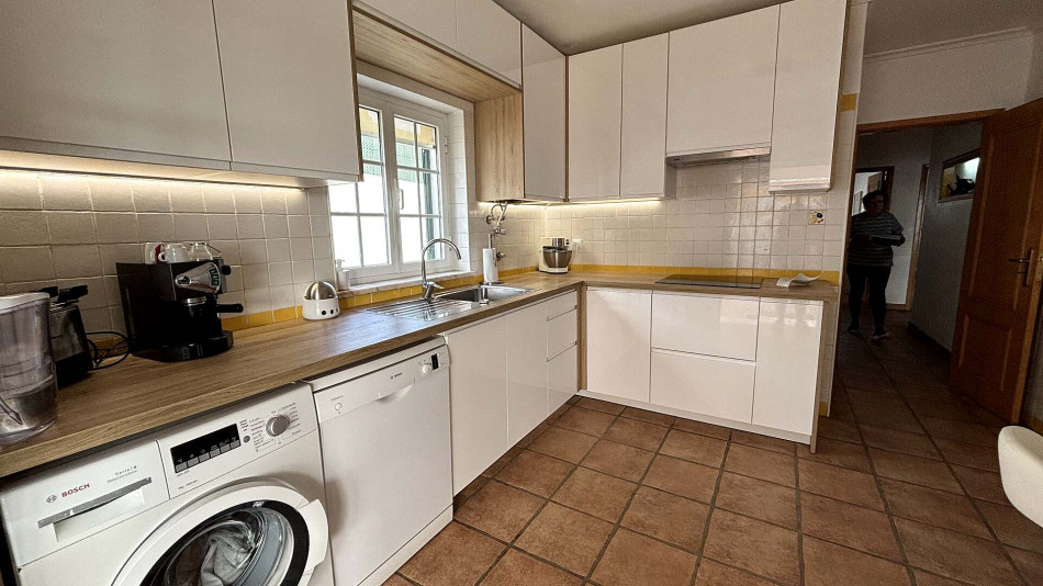 Upstairs, the main living area comprises a welcoming entrance hall, two bedrooms with built-in wardrobes (one of which is an en-suite), a bright and spacious living room, and a social bathroom. The fully equipped kitchen includes a pantry and offers direct access to a generous terrace, perfect for outdoor dining and relaxing. The living room also opens onto this sunny terrace, creating an ideal indoor-outdoor flow.