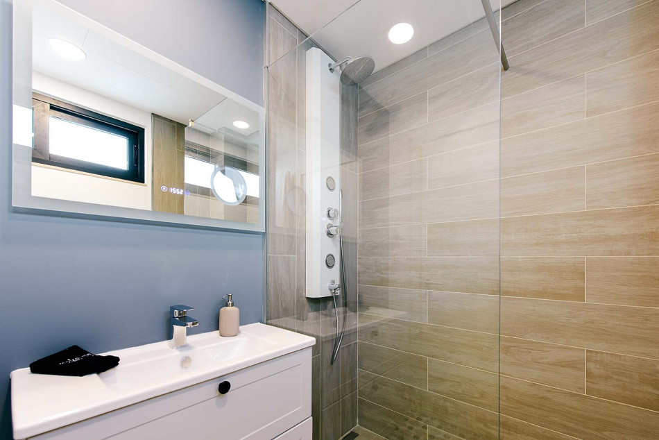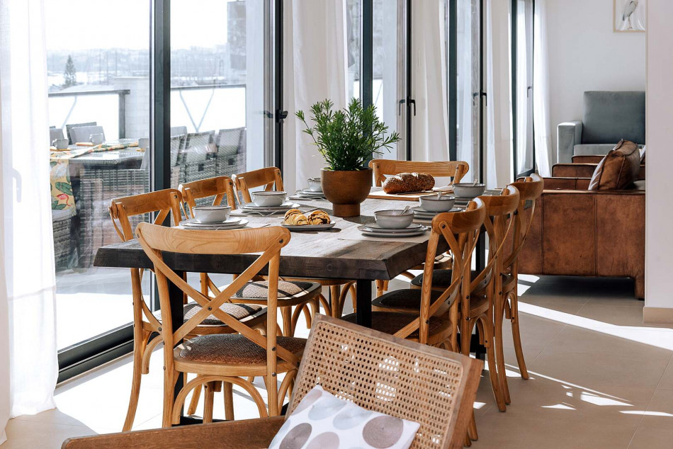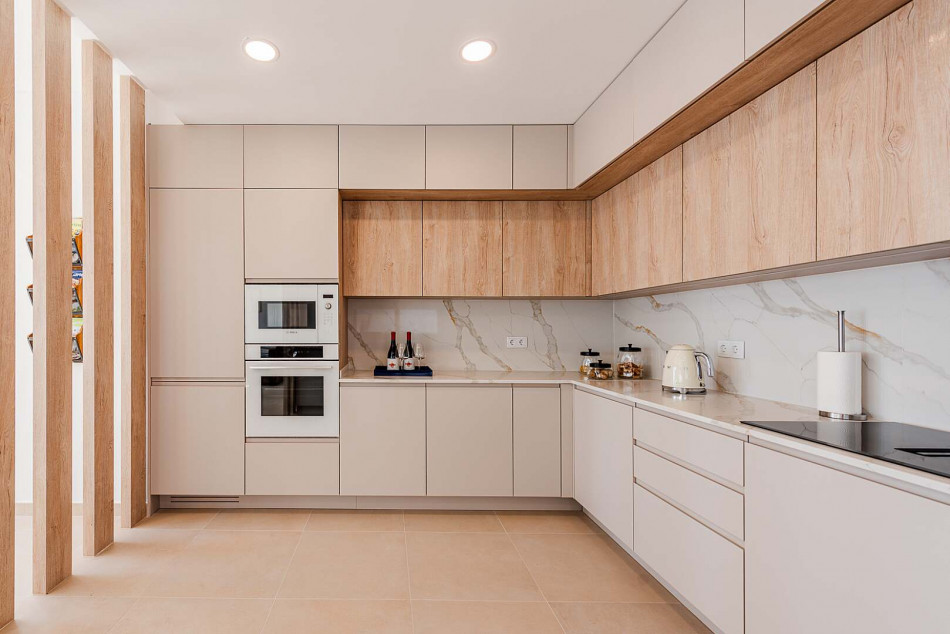 Kitchen: The kitchen reflects luxury and functionality, with high-gloss cabinetry, wood accents, and granite countertops. Outfitted with high-end German appliances, an induction hob, and stylish porcelain tiles, it’s designed to make cooking both practical and enjoyable. The space is further enhanced by a wood-slatted room divider, creating a balanced aesthetic between form and function.