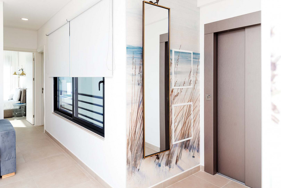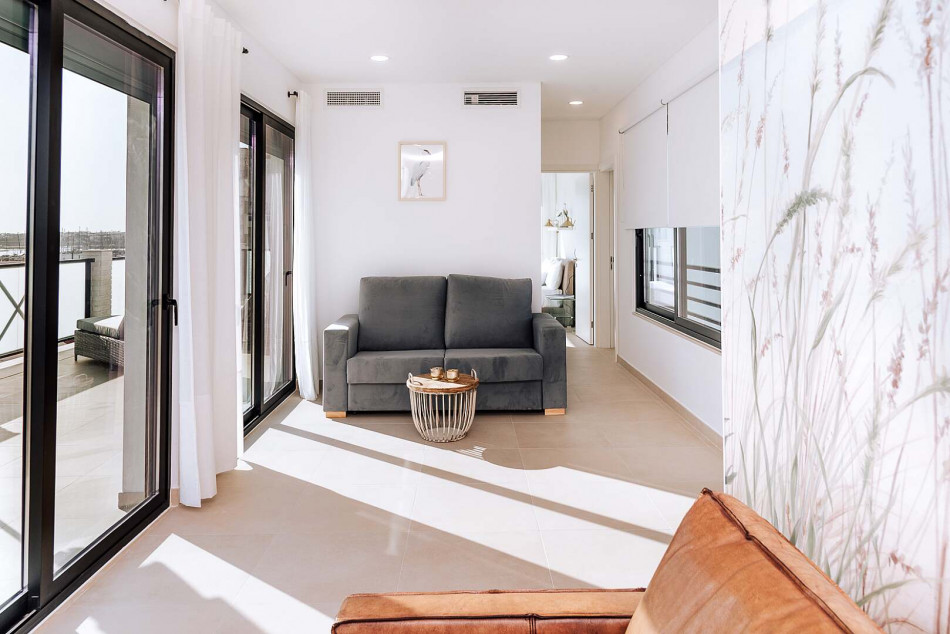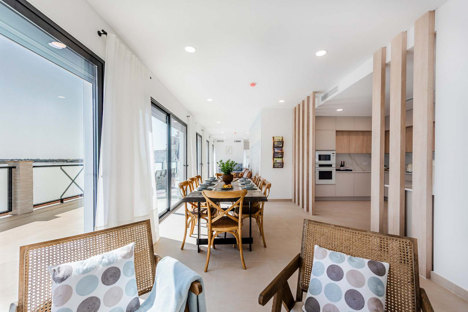 Interior Design: The penthouse interiors embody elegance through a modern coastal aesthetic, featuring natural sandy hues, sleek lines, and high-quality materials. In the living room, floor-to-ceiling panoramic windows invite ample natural light. Offering sweeping views and a seamless indoor-outdoor feel. Premium finishes such as porcelain tiles, wood, and marble-clad walls add an air of refinement. While the open floor plan enhances spaciousness and comfort.