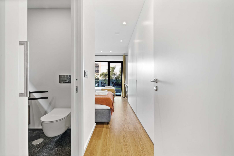 Este apartamento dispõe de três casas de banho bem projetadas. Duas são suítes privativas, cuidadosamente concebidas para oferecer privacidade e conforto a cada quarto. A terceira é uma elegante casa de banho social, ideal para receber convidados. Cada casa de banho apresenta acabamentos contemporâneos, acessórios de alta qualidade e um design sofisticado que complementa o estilo de vida moderno.
