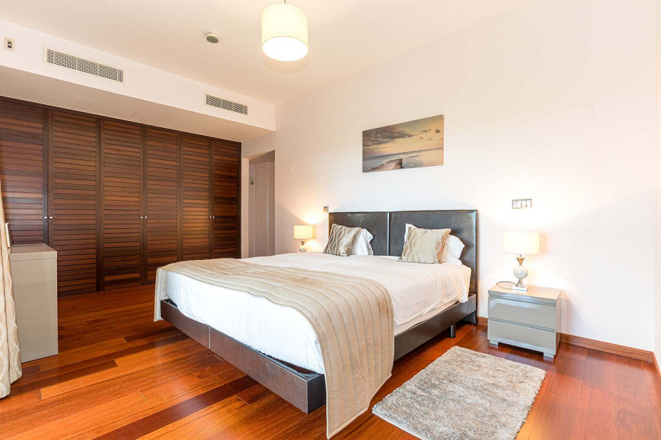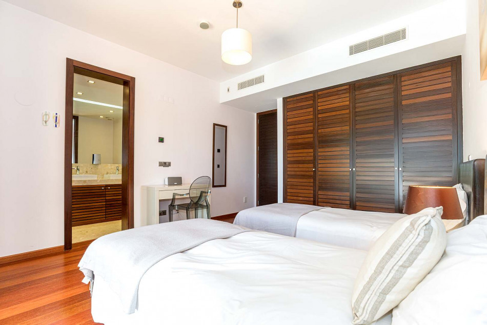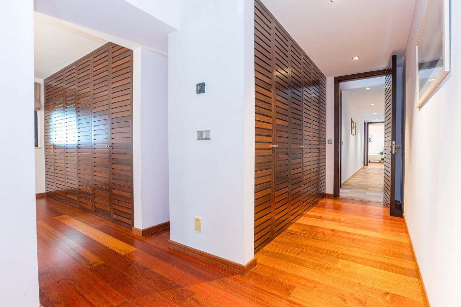 American Cherry Wood Finishes: Doors, wardrobes, and flooring in the bedrooms exude sophistication, while tiled flooring complements the living areas.