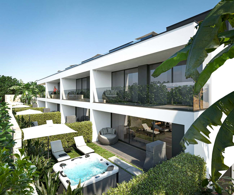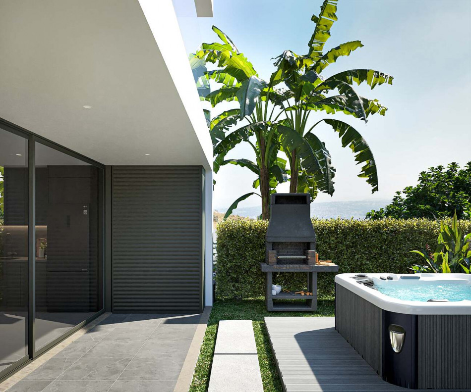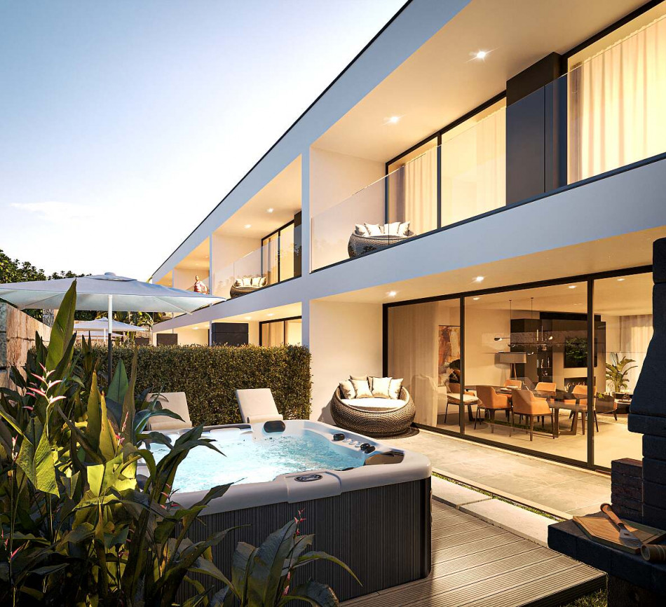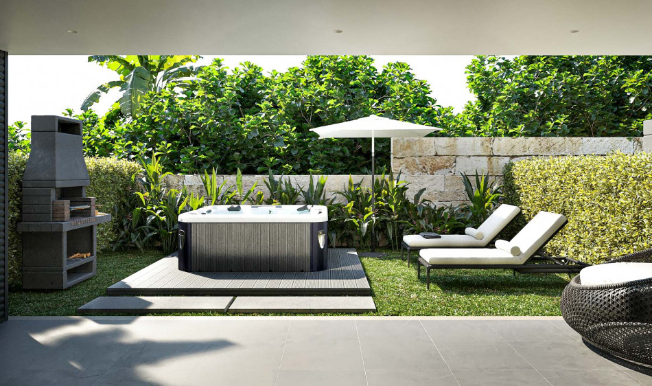 Private garden with treated wood decking, Jacuzzi, BBQ area, palm trees, perimetre hedges, and automatic irrigation