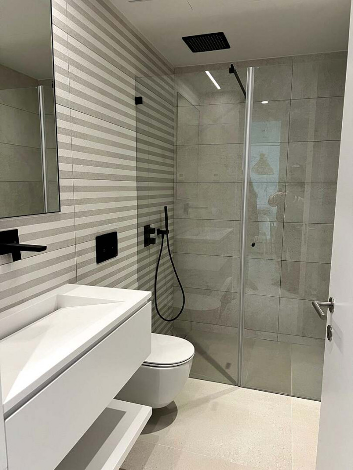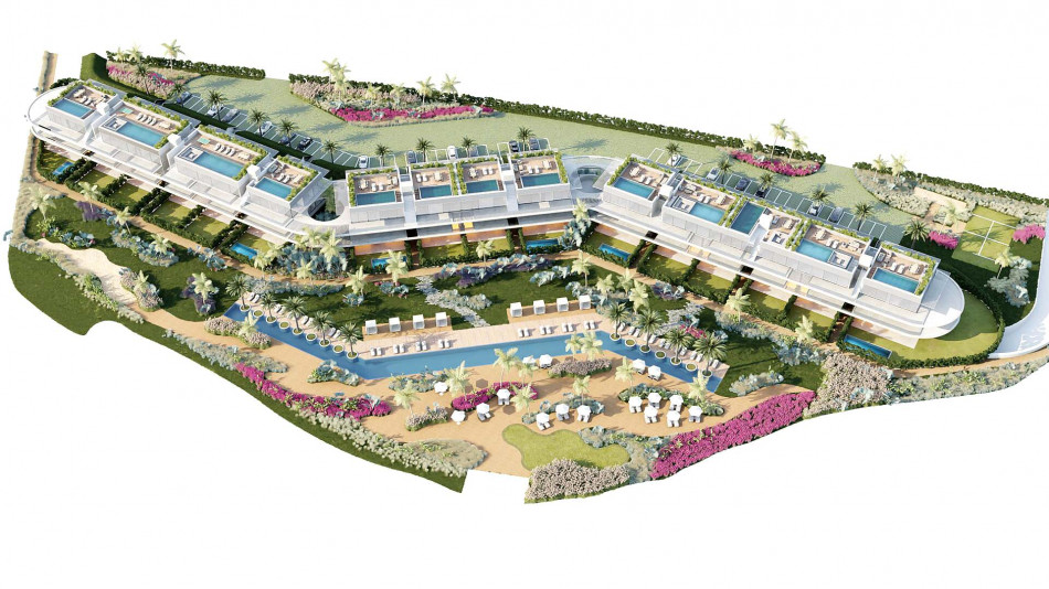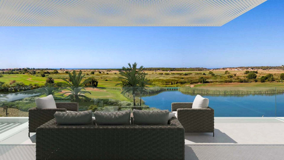 Both bedrooms feature en-suite bathrooms appointed with Hansgrohe fixtures and handcrafted tiles, with the master suite opening to a private terrace that captures breathtaking sunset views over the fairways. The expansive main terrace, accessible from the living area, creates a seamless indoor-outdoor living experience perfect for entertaining or private reflection.