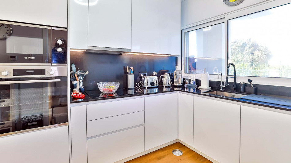 The contemporary kitchen is fully fitted with state-of-the-art appliances and seamlessly connects to the dining area and cosy living room.