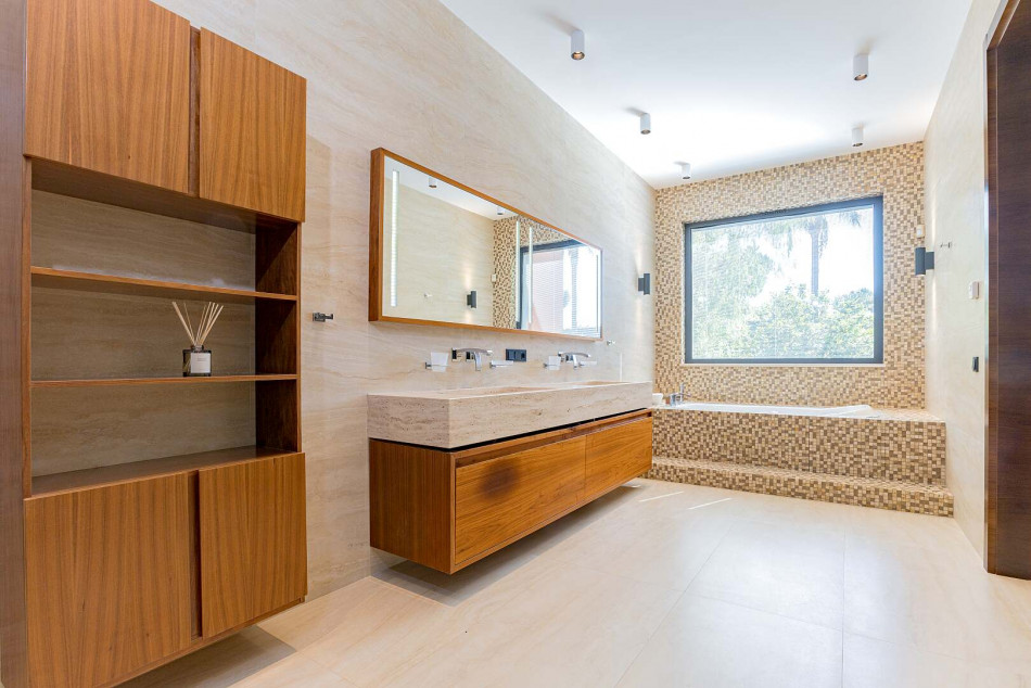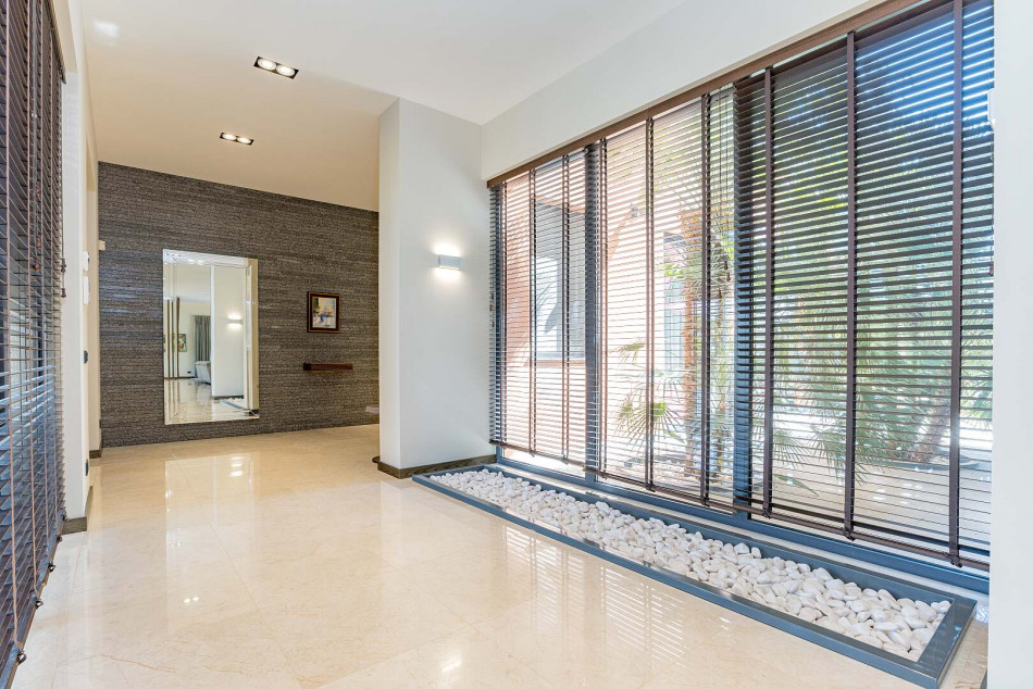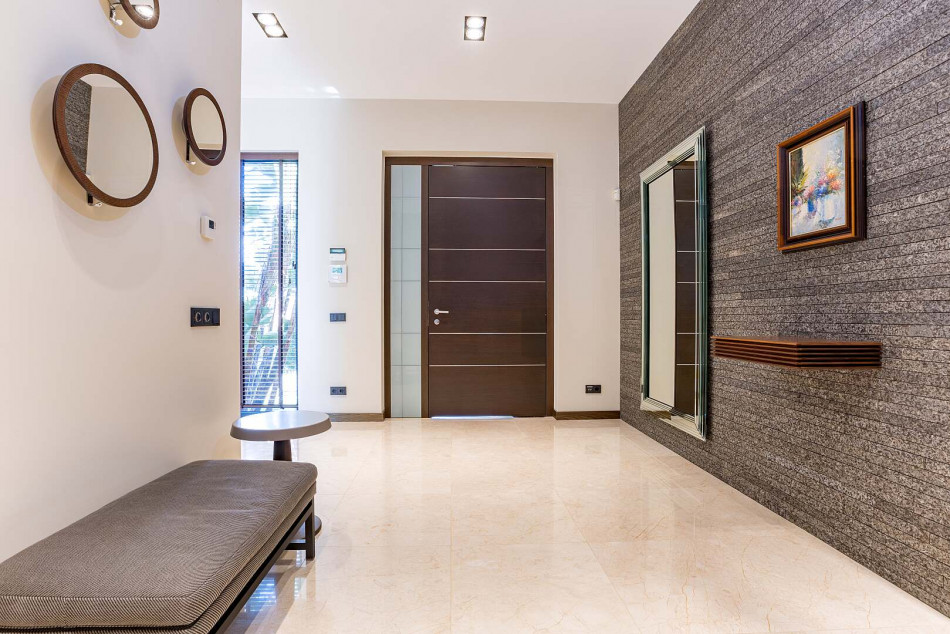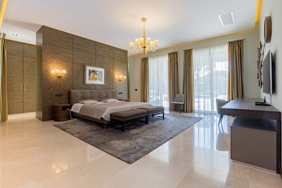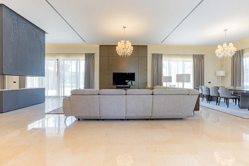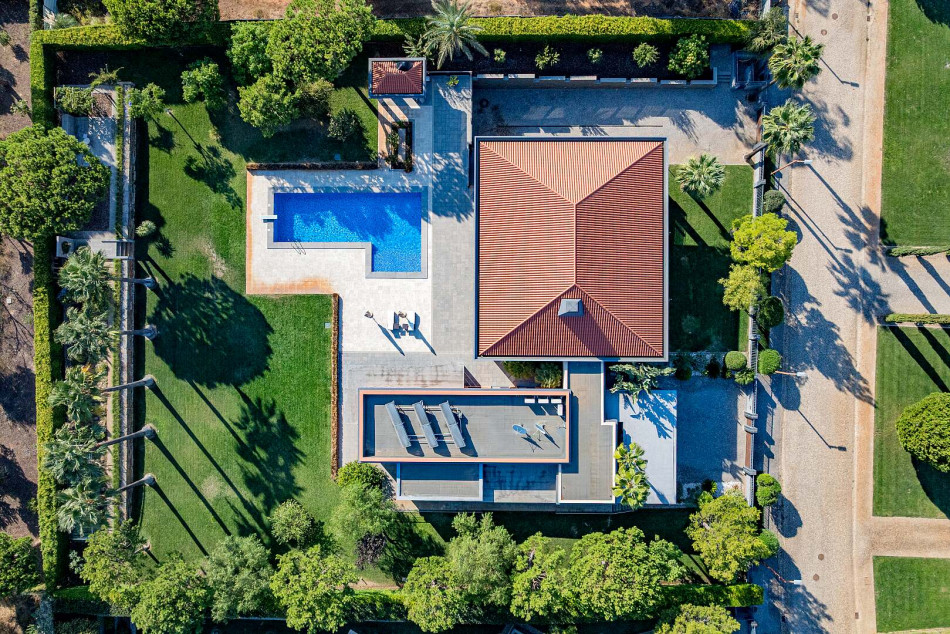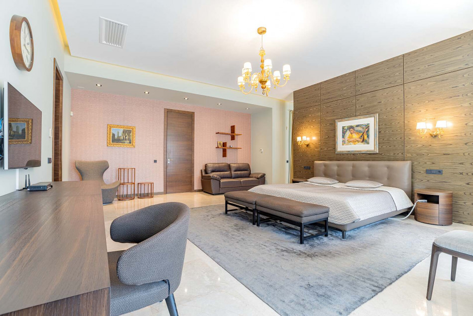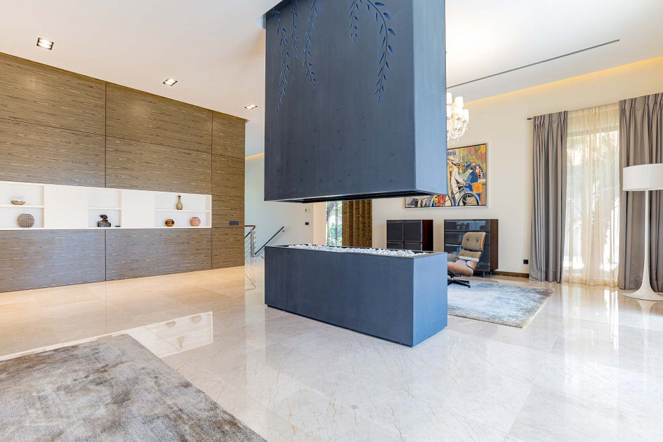 The villa’s architecture draws inspiration from contemporary Mediterranean sensibilities – clean lines, warm tones, and an earthy palette. Locally sourced natural stone clads both interior and exterior surfaces, grounding the home in its environment while exuding timeless elegance.