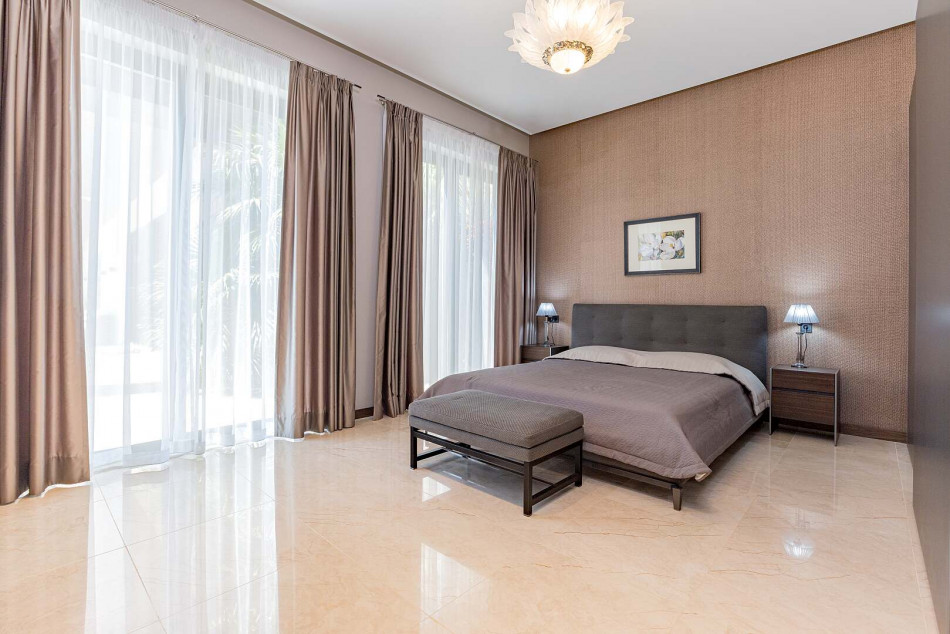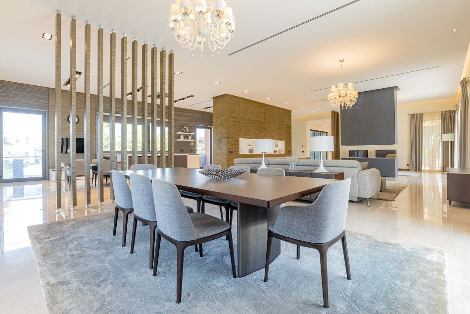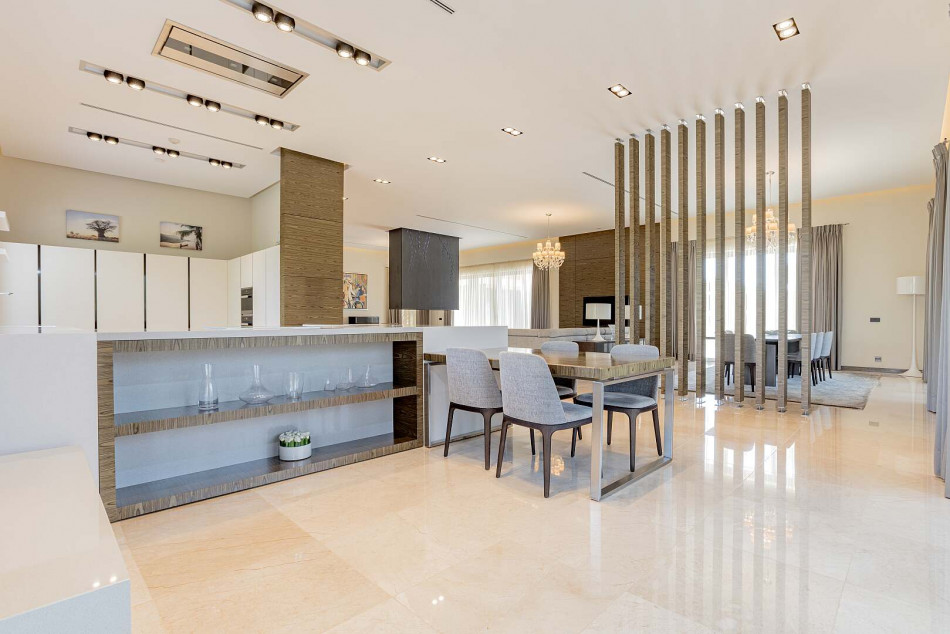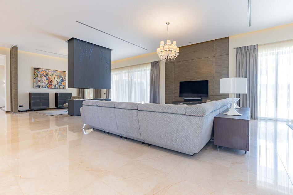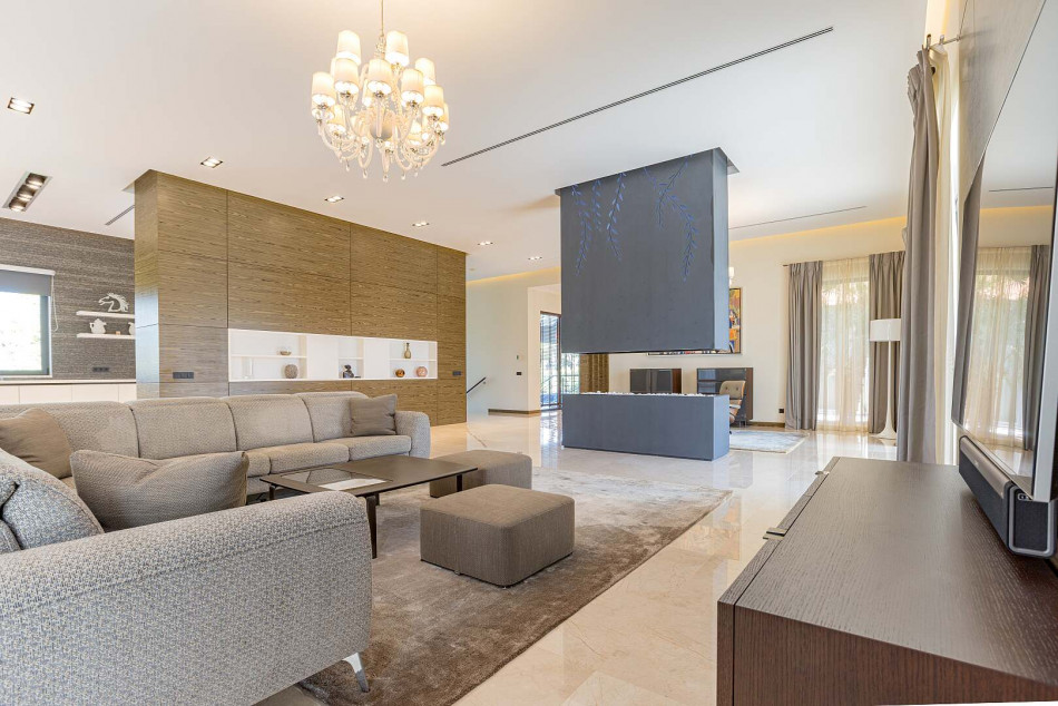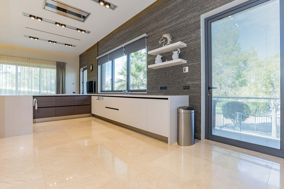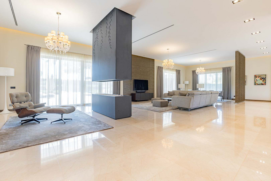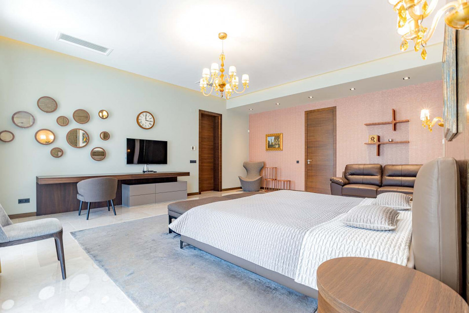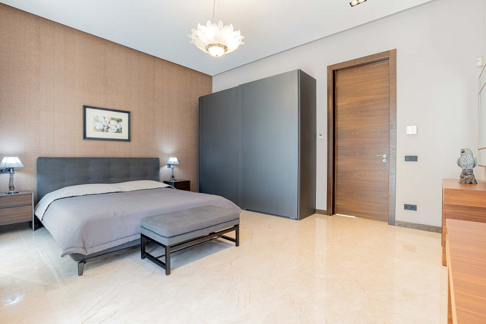 The villa’s architecture draws inspiration from contemporary Mediterranean sensibilities – clean lines, warm tones, and an earthy palette. Locally sourced natural stone clads both interior and exterior surfaces, grounding the home in its environment while exuding timeless elegance.